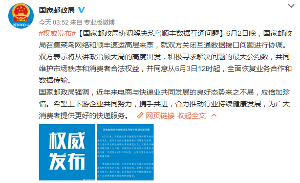 国家邮政局今天凌晨发布公告,称国家邮政局召集菜鸟网络和顺丰速运高层来京,就双方关闭互通数据接口问题进行协调。菜鸟、顺丰同意从6月3日12时起,全面恢复业务合作和数据传输。